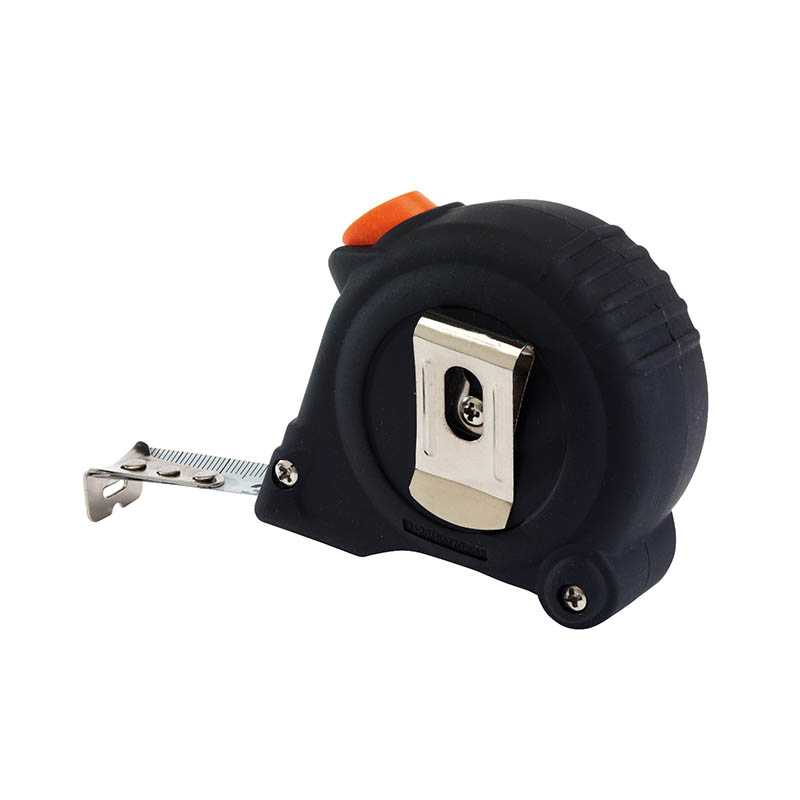Metal and rubber tape measure (3 meter) with a wrist strap and belt clip attachment.