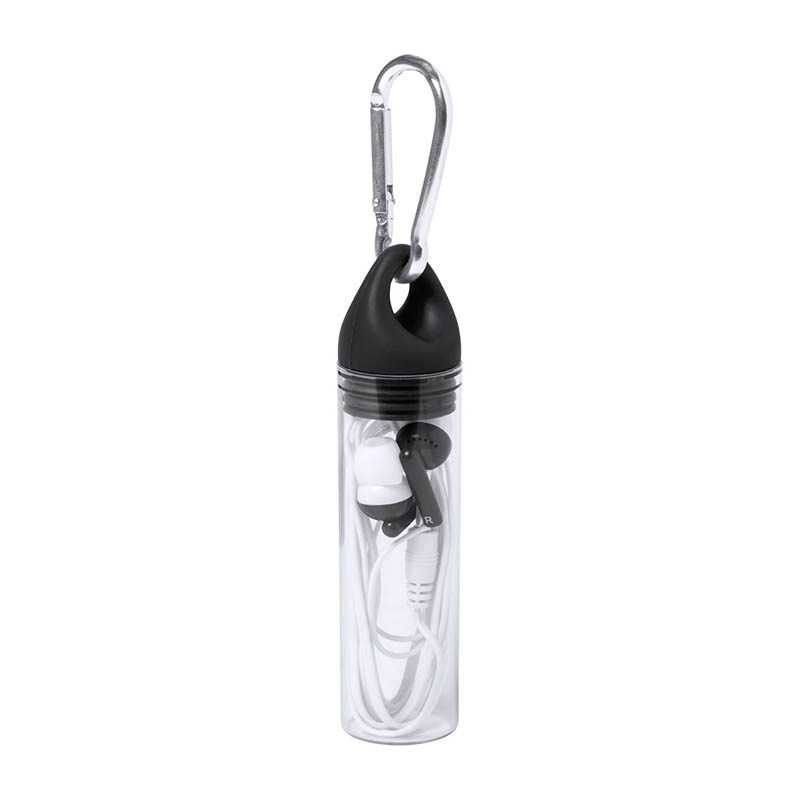 Sluchátka do uší s 3,5 mm audio Jackem, v plastové krabičce s karabinkou a stejně barevným vrškem.