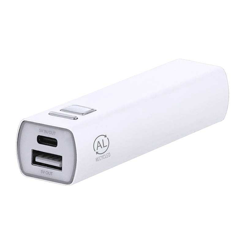 Powerbanka 2200 mAh z recyklovaného hliníku. Kapacita pro smartphone, DC 5V/1A. Včetně USB kabelu s micro USB konektorem. Indikační světlo.