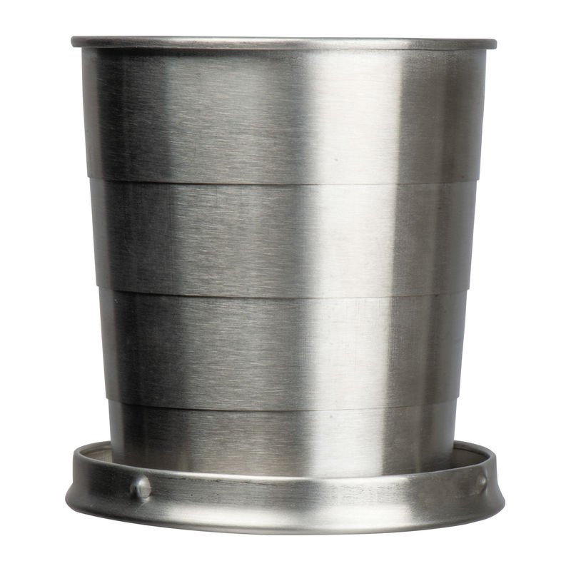 Skladací pohár na pitie z nehrdzavejúcej ocele s objemom 250 ml. Dá sa uložiť do integrovanej kovovej plechovky s karabínou, čím sa šetrí miesto, a je ideálny na všetky outdoorové aktivity.