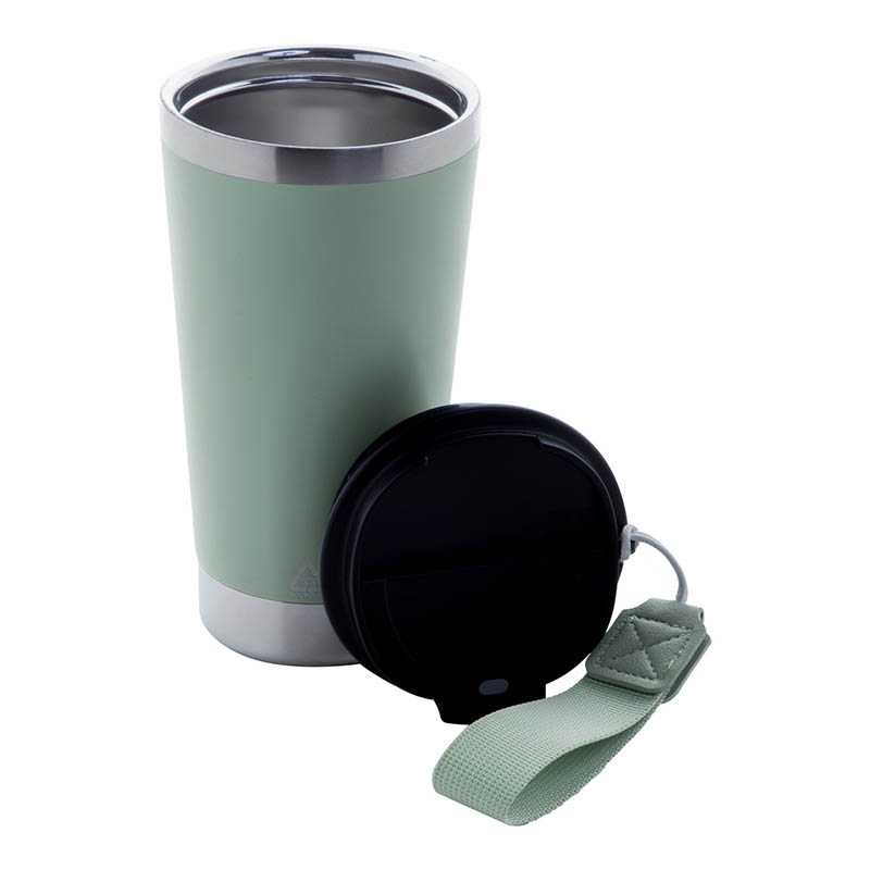 Dvojstenný termo hrnček z recyklovanej nerezovej ocele s viečkom na pitie z PP a popruhom na prenášanie v zodpovedajúcej farbe. 430 ml.
