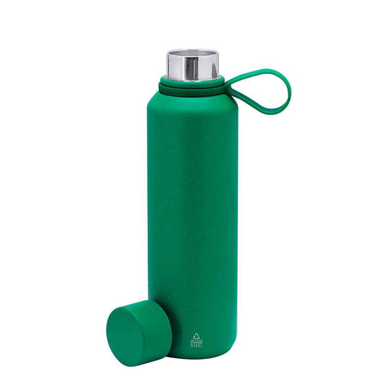 NOVINKA 2025. Thermal bottle with a capacity of 630 ml, made of Recycled Stainless Steel with double wall. Includes matching silicone handle. BPA-free. With a Recycled Stainless Steel label.Steel is one of the most demanded materials and can be found almost everywhere, from daily-use products to large constructions. With countless properties, among which durability and high level of reusability stand out, making it a highly valued alternative in sustainability solutions. Properly treated, it allows obtaining new resources of infinite use.