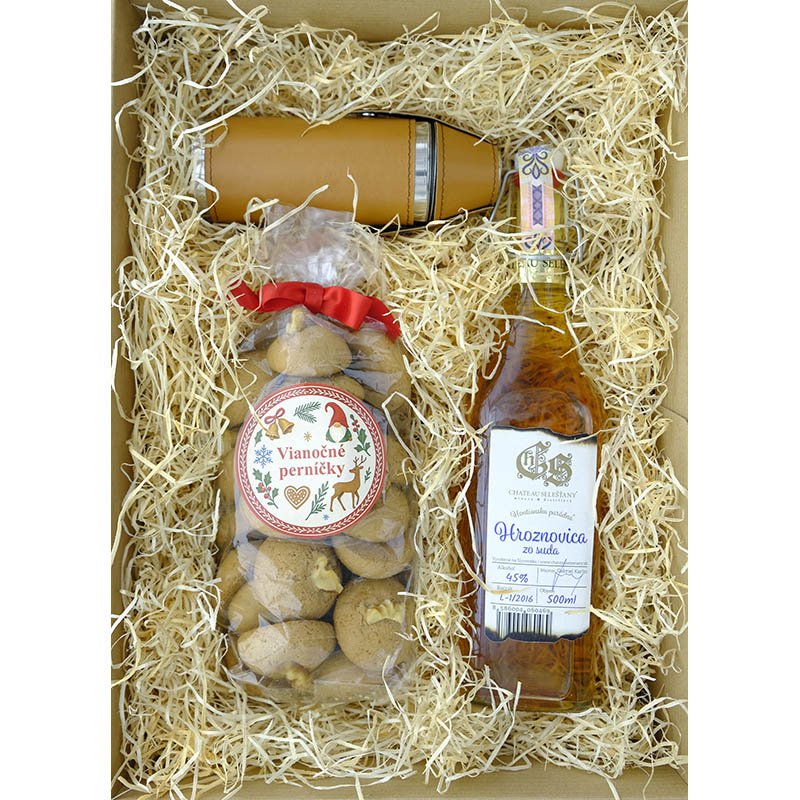 Darčeková krabica > prírodná >36x26x10 cm, Destilát Chateau Selešťany Hontianska parádna - Hroznovica zo suda 45% > 0,5l, Vianočné perníky 250g, Nerezová fľaša s 2 pohármi > hnedá