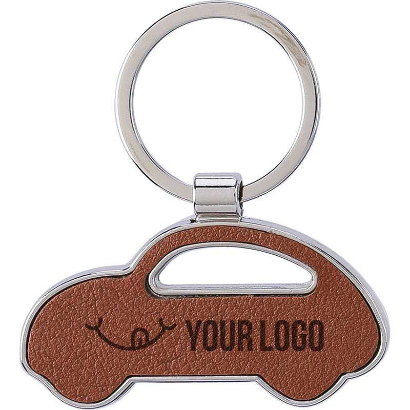 NOVINKA 2025. Recycled leather keychain with a metal ring. Car shape. Includes embossed recycled leather logo on the side. Individually packaged in a brown cardboard sleeve.