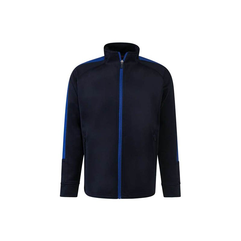 100 % polyester Interlock.Panely na vonkajšom rukáve v kontrastnej farbe.Stredový predný zips v kontrastnej farbe.Bočné vrecká na zips.Rolákový golier.1 x 1 rebrované manžety.Poloautomatické jazdce na všetkých zipsoch.