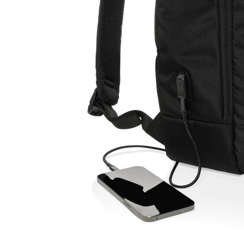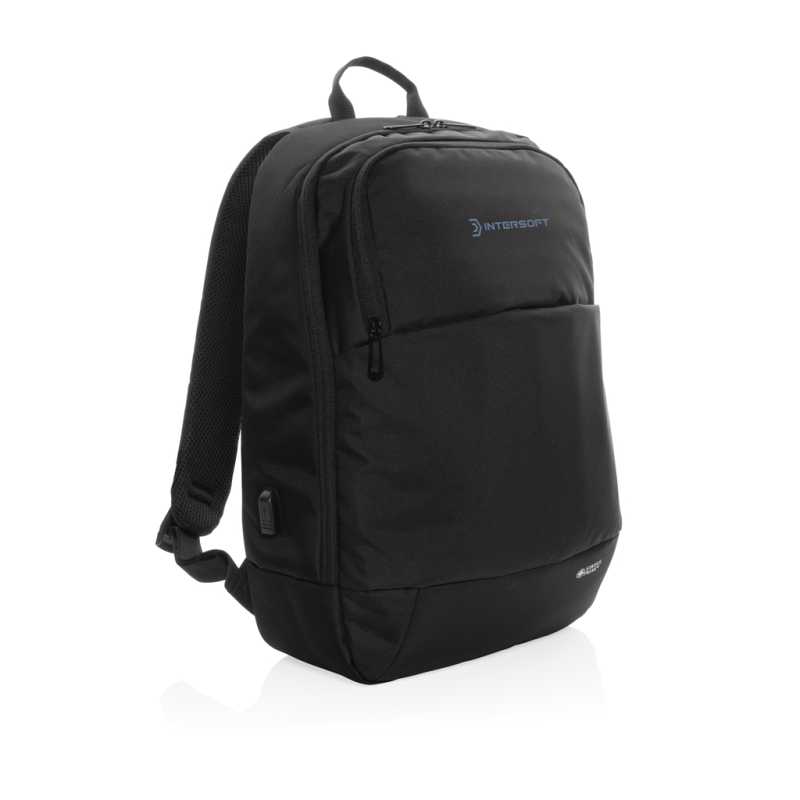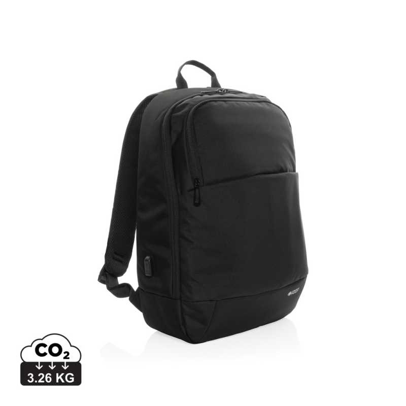 Moderne navrhnutý batoh na každú príležitosť. Hlavný úložný priestor na zips vrátane oddielu na 15,6" notebook, predný priestor na zips. Cez vonkajší USB A port je možné jednoducho nabíjať telefón z powerbanky, ktorú uložíte v batohu. Vyrobené z recyklovaného polyesteru AWARE™. Na výrobu bolo využité 28,7 500ml PET fliaš. Z výťažku každého predaného kusu navyše prispievame 2% na podporu iniciatívy Water.org bez PVC.
