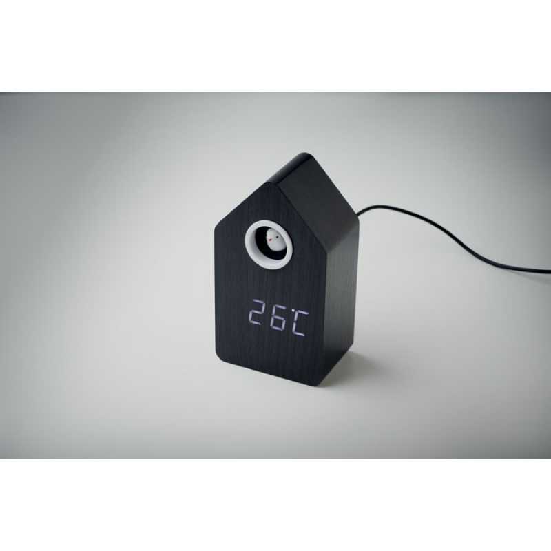 Kukačkové hodiny z MDF s vestavěným budíkem/ukazatelem teploty. Ptáček vykoukne a kuká každou celou hodinu a také během budíku. Bílý LED displej. Zvuk se automaticky ztlumí mezi 22:00 a 6:00.