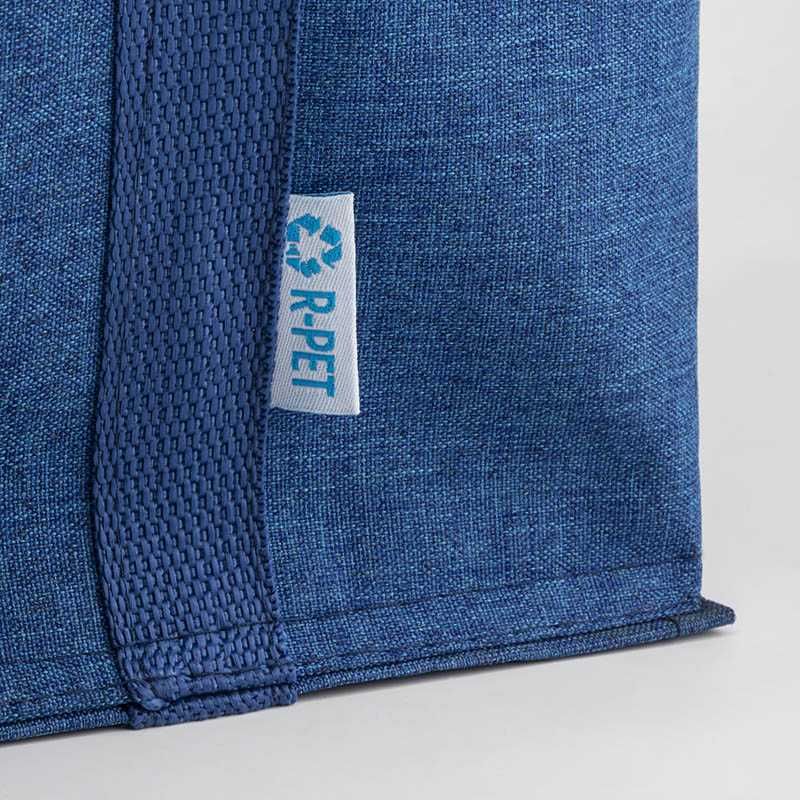 NOVINKA 2025. Cooler bag in durable 600D RPET polyester made from recycled plastic, to encourage the reuse of plastic waste and contribute to the sustainability of the planet. Main compartment in mesh, with zipper closure. Base with integrated cooler, manufactured in resistant 600D RPET polyester, with PEVA isothermal inside. Reinforced carry handles and large front pocket, with RPET emblem on outside label.