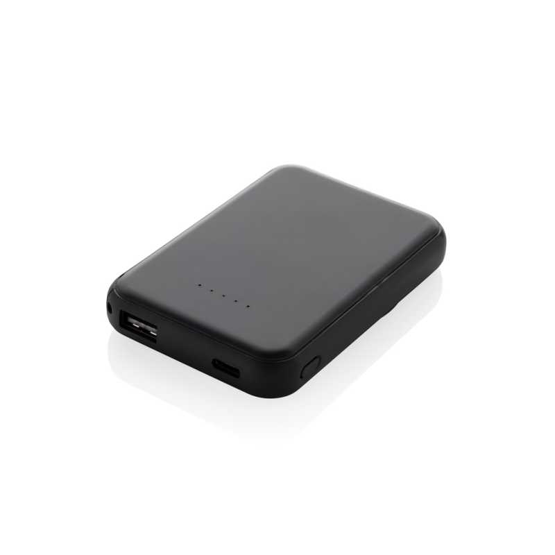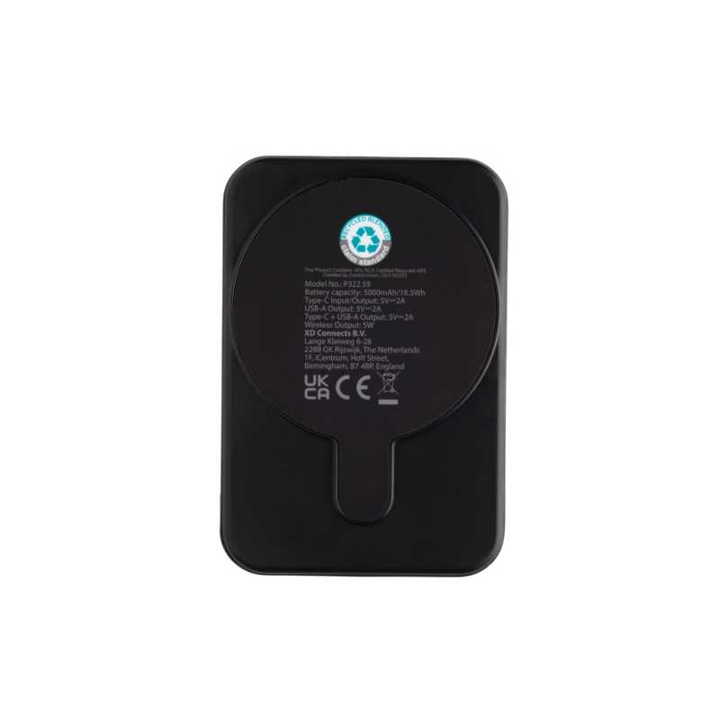 NOVINKA 2025. Vrecková powerbanka s kapacitou 5 000 mAh a 5W magnetickou bezdrôtovou nabíjačkou, ktorej puzdro je vyrobené z recyklovaného ABS plastu s certifikáciou RCS. RCS je štandard pre overenie recyklovaného obsahu výrobku v celom dodávateľskom reťazci. Celkový recyklovaný obsah: 20 % na základe celkovej hmotnosti výrobku. S možnosťou výstupu USB A a UCB C. Powerbanka obsahuje lítium-polymérovú batériu triedy A s dlhou výdržou 5 000 mAh. Vstup typu C 5V/2,4A; výstup USB C/USB A: 5V/2A.4A. Položka a príslušenstvo neobsahujú PVC. Vrátane recyklovaného nabíjacieho kábla TPE s certifikáciou RCS. Balené v zmiešanom obale FSC®.