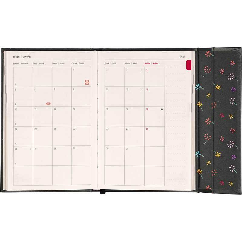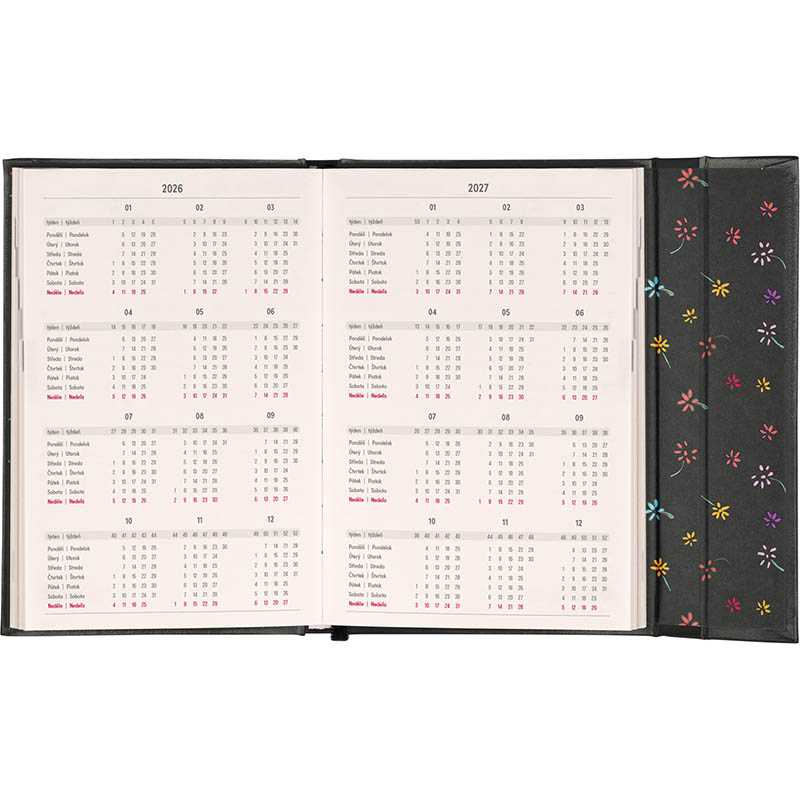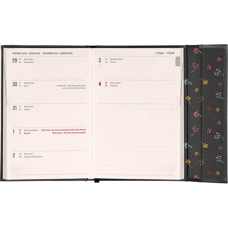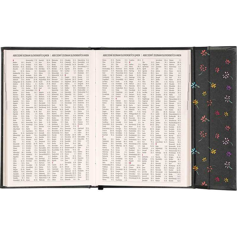Obsahuje české a slovenské mená. Súčasťou je záložka a vnútorné vrecko.Rozsah: 144 vnútorných strán + 8 ilustrácií. Rozmer: 11 x 16 cm. Hmotnosť: 0,2. Papier: krémový. Väzba: tuhá knižná s magnetickým uzatváraním. Kalendárium: týždenné 2 jazyčné (CZ, SK).