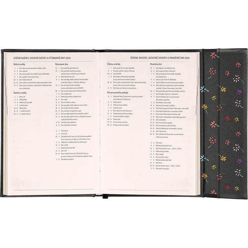 Obľúbený týždenný diár má oderuvzdorný povrch s motívom folklórnej stuhy. Efektná razba fóliou a 3D lak vytvárajú dokonalý dizajn. Jediný svojho druhu na trhu.Kalendárium: SK/CZ-UK-DE. Rozsah: 176 listov. Formát: 14,2 x 20,4 cm.