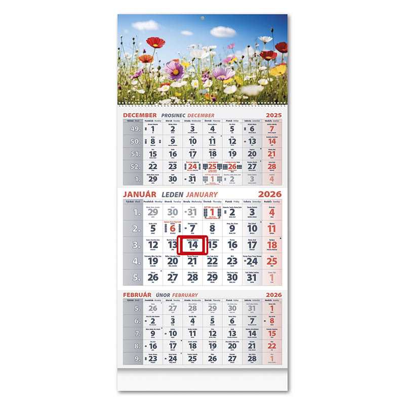 Prehľadný dvanásťlistový trojmesačný nástenný kalendár s jednou špirálou je veľmi populárny a žiadaný. Má posuvné okienko pre lepšiu orientáciu v mesiaci, kalendárium so slovenskými a českými menami a sviatkami, a tiež sviatkami krajín EÚ. Vhodný aj pre organizácie a spoločnosti. Ponúka možnosť umiestnenia vlastnej grafiky namiesto obrázku na vrchný lash, či potlač podložky. Na druhej strane vrchného lashu nájdete kompletný prehľad sviatkov vo všetkých krajinách EÚ.
