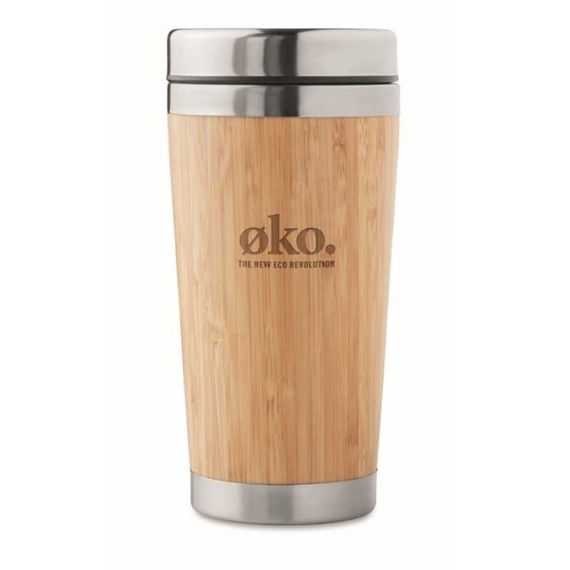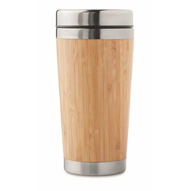 Dvojplášťový, vzduchom izolovaný pohár z nerezovej ocele a bambusu s AS viečkom s posuvným uzáverom. Kapacita až 350 ml. Dodávané v darčekovej krabičke z kraftového papiera. Keďže výrobok je vyrobený z prírodných materiálov, farba a výsledok tlače sa môžu medzi výrobkami líšiť. o80 x 108 mm