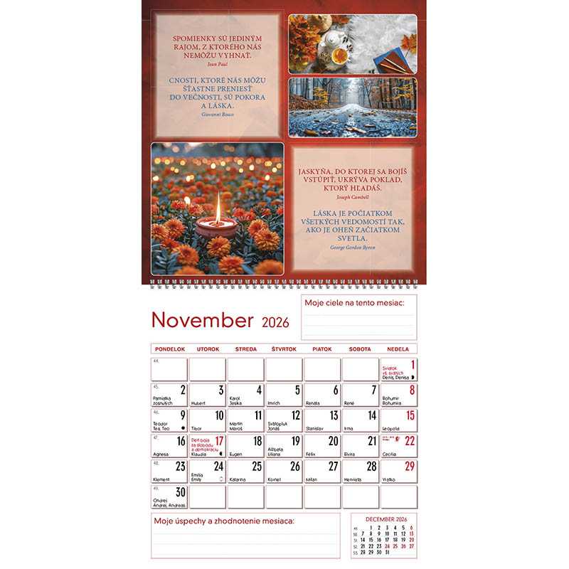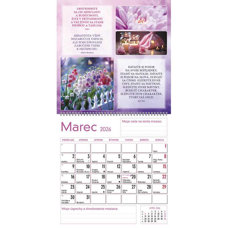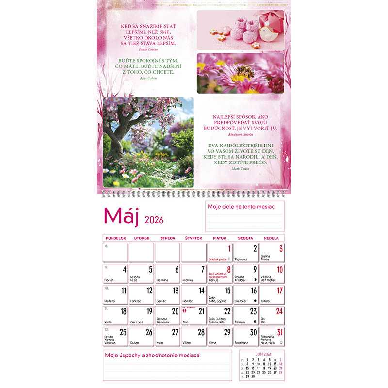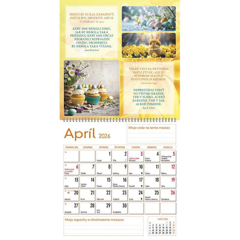 Kalendár, ktorý vás bude po celý rok sprevádzať pozitívnymi myšlienkami a povzbudeniami. Každý mesiac si môžete stanoviť vlastný cieľ, sledovať svoj pokrok a zaznamenávať úspechy. Súčasťou kalendára sú aj samolepky, ktorými si zábavne a výstižne vyznačíte nálady, činnosti či malé víťazstvá. Odporúčame ako inšpiratívny darček – ideálne v kombinácii so Stolovým motivačným kalendárom S24-26 a Motivačným diárom D47-26 alebo D48-26. Priestor na potlač: 30 x 6 cm. Kalendárium: SK. Rozsah: 14 listov. Formát: 30 x 30 cm.