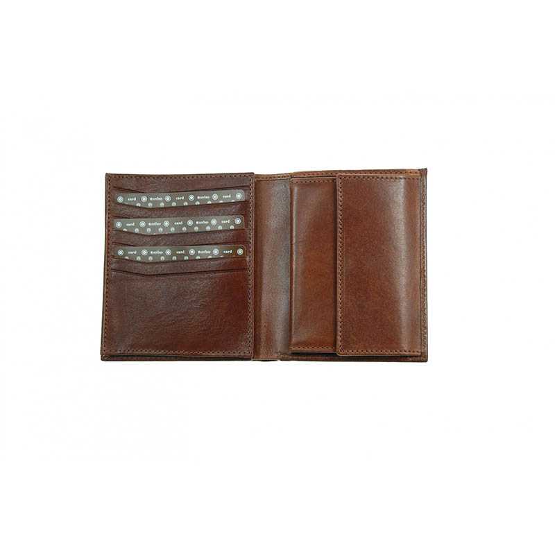 Pánska peňaženka z najkvalitnejšej talianskej hnedej hladkej hovädzej kože so zachovaním prirodzenej štruktúry. Nafarbená jemným tampónovaním.8 priestorov na karty, 3 na doklady (1 priehľadný), 2 na bankovky, samostatný na mince