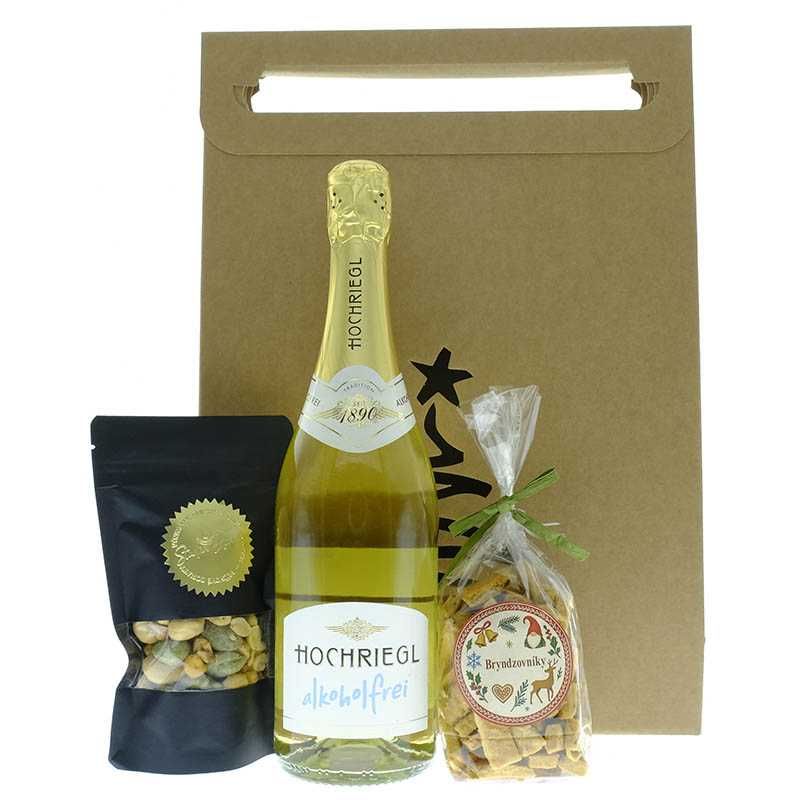 Darčeková taška stredná > prírodná > 40x28x10 cm, BASIC - zmes orieškov 100g, Hochriegl nealkoholické, šumivé víno, alkohol 0%, Rakúsko, 750 ml, Bryndzovníky 150g