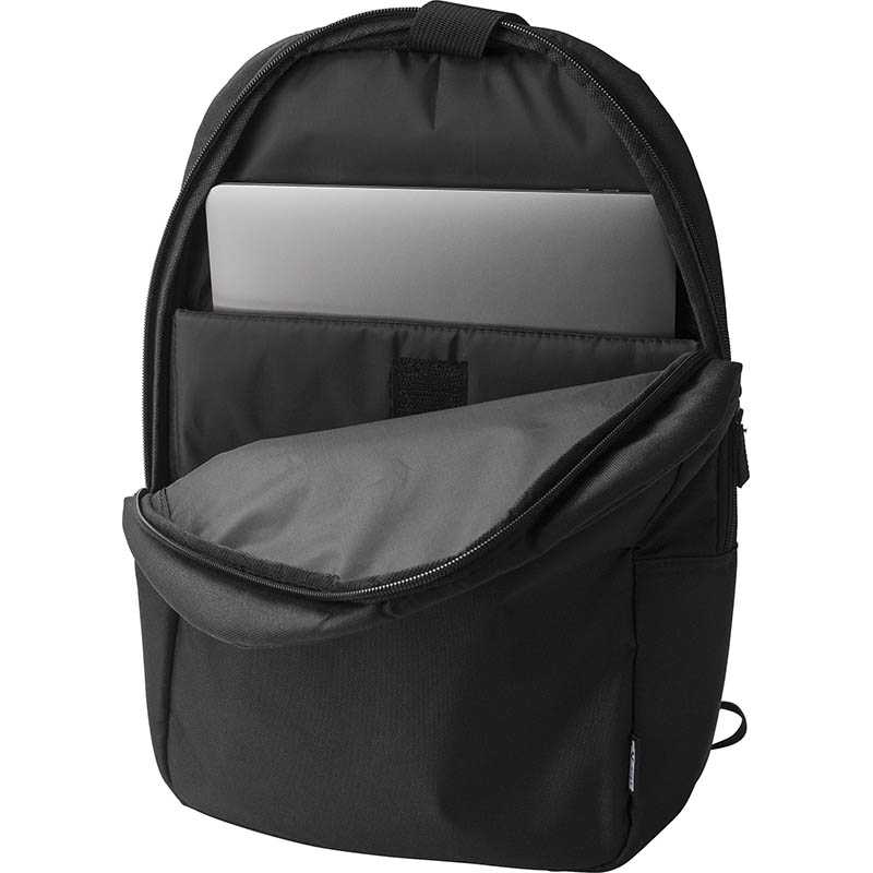 RPET polyester (600D) laptop backpack (15 inch). One large compartment. Small zippered pocket on front.