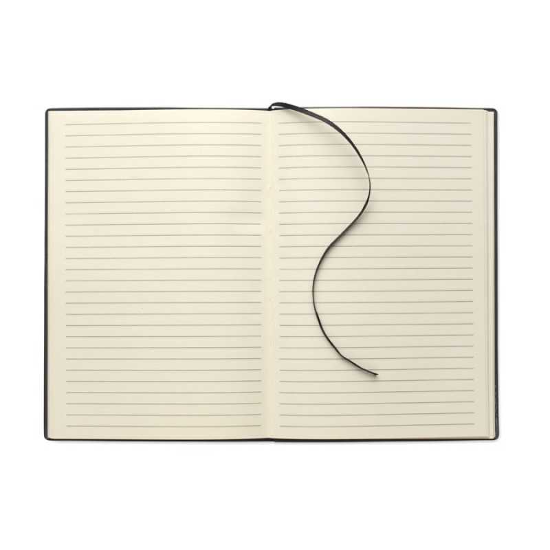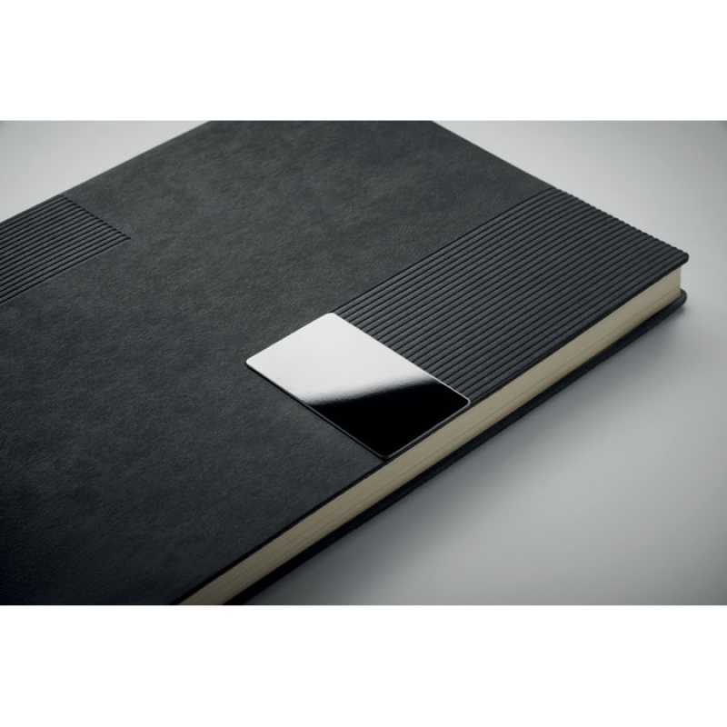 Zápisník A5 s měkkými PU deskami. 160 linkovaných stran (80 listů) z recyklovaného papíru (80 listů). Ladící gumička a záložka se stužkou. Kovový detail na přední straně.