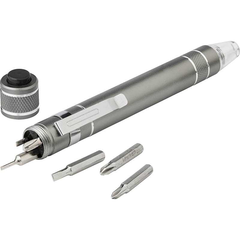 Aluminium pen shaped pocket screwdriver with light. Including: three flat-head and three cross-head screwdriver bits. Batteries included.