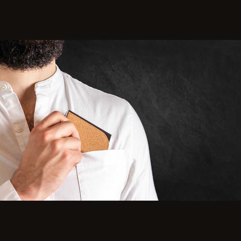 NOVINKA 2024. Kovový vizitkár s korkovým povrchom a vnútri s hnedým saténom a magnetickým zatváraním.