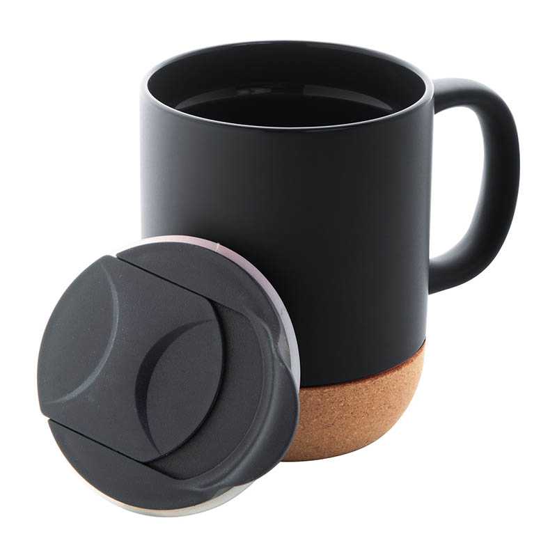 Vysoko kvalitný keramický hrnček s prírodným korkom a PP plastovým viečkom na pitie. S matnou vonkajšou a lesklou vnútornou povrchovou úpravou. 325 ml. V kraftovej papierovej krabici.