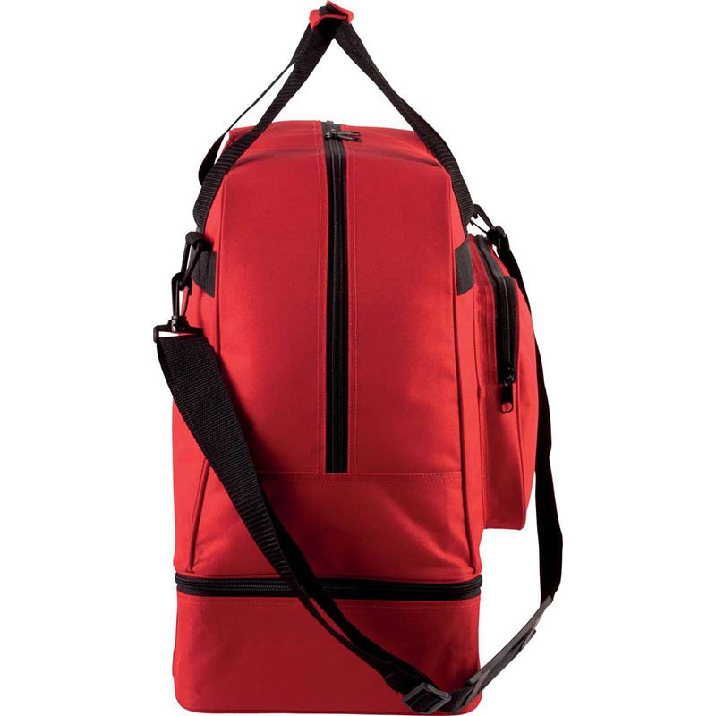 Three-Tone Sports Holdall with Spikes. Made of thick and durable outer waterproof fabric and smooth inner lining, the bottom is equipped with rubber spikes providing traction and stability. Adjustable shoulder straps with sliders and padded reinforcement, two central handles that are joined by velcro for greater comfort. U-shaped top main pocket, with double-pull zipper closure that allows it to be opened on both sides. An inner zippered pocket, a large central pocket with three interior mesh compartments for better storage of items and two large side pockets (one with an inner bag for shoes) all with double-pull zipper. Suitable marking methods: screen printing, transfer printing, vinyl application, embroidery.Ideal for sports clubs and individual use.
