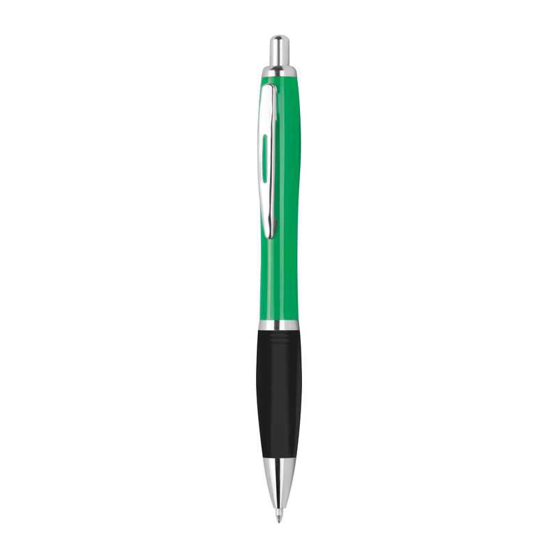 Plastové guľôčkové pero s farebnými doplnkami a chrómovou špičkou. Dodávané s modrou náplňou.