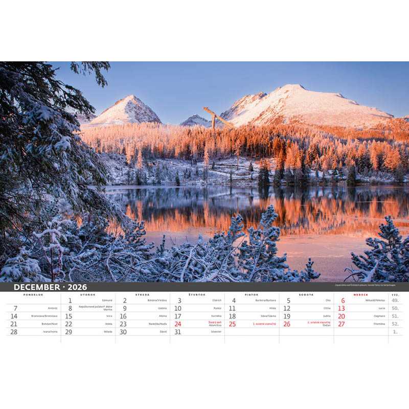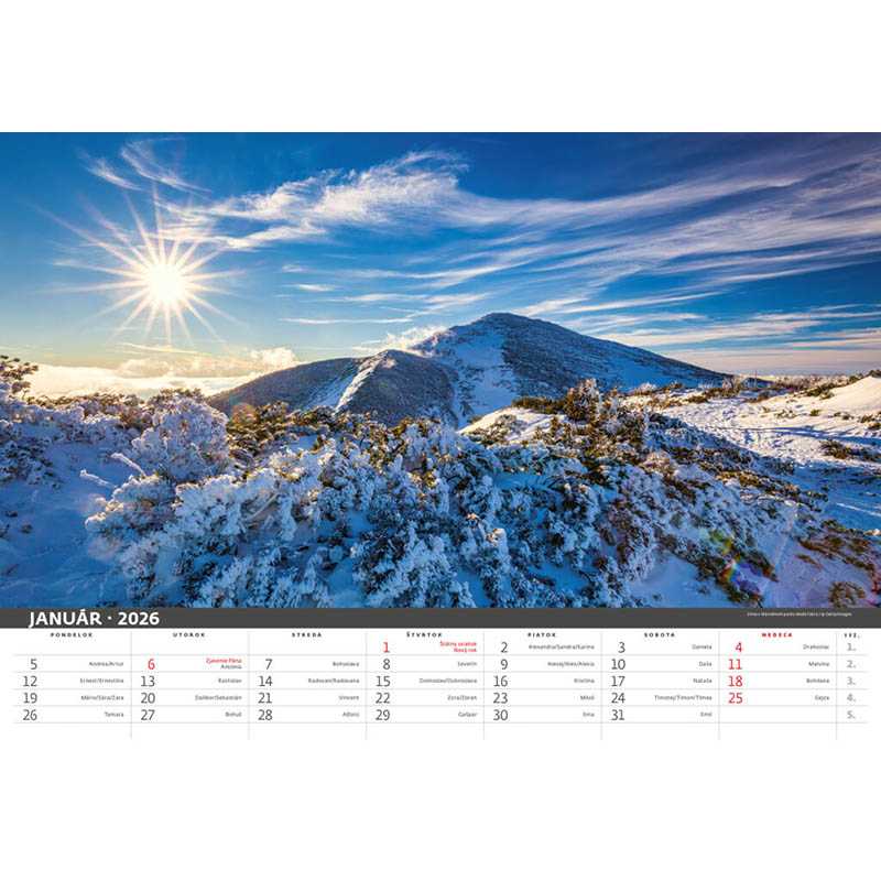 Kalendár Malebné Slovensko 2026. Formát kalendára: 45 x 31,5 cm. Kalendárium: slovenské mesačné menné. Rozsah kalendára: 14 listov. Twinová väzba. Priestor na potlač: 45 x 7 cm. Autor: Jozef Sádecký