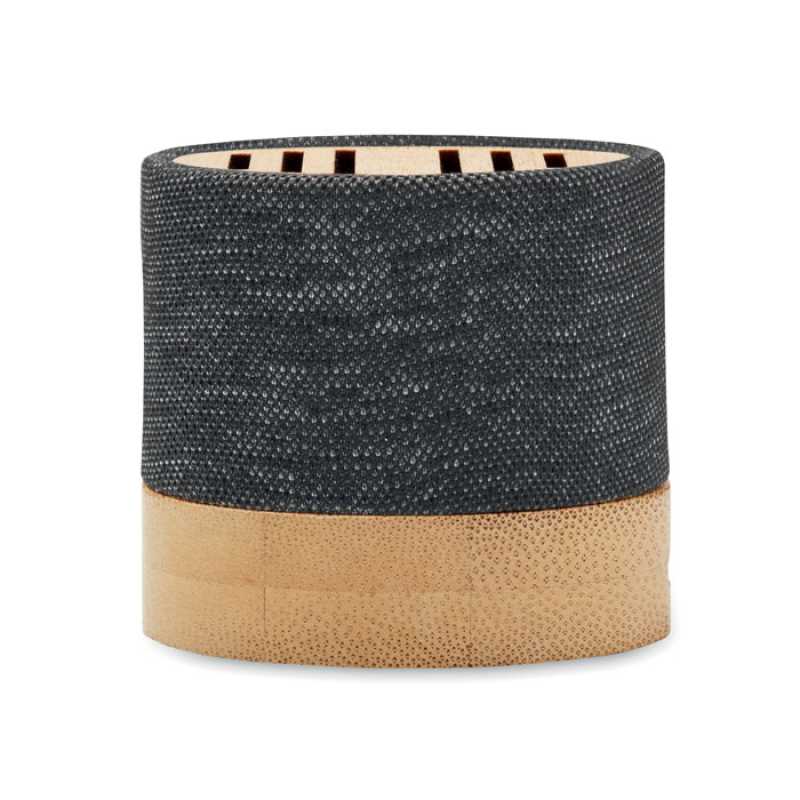 Bezdrátový reproduktor 5.0 v krytu z RPET s bambusovým detailem na horní straně. Se světelnou LED indikací, 1 dobíjecí baterií Li-ION 300 mAh, portem pro SD kartu a kabelem AUX/USB. Funkce volání handsfree. Výstupní údaje: 3W, 3 Ohm a 5V. Doba přehrávání