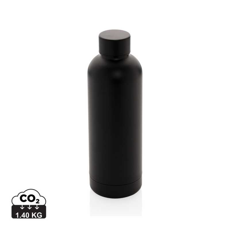 Dvoustěnná láhev z 90 % recyklované nerezové oceli a 10 % nerezové oceli, s integrovaným poutkem a dalším dlouhým páskem (70 cm) ve víčku z PP. Kelímek ve spodní části lahve. Objem 500 ml.