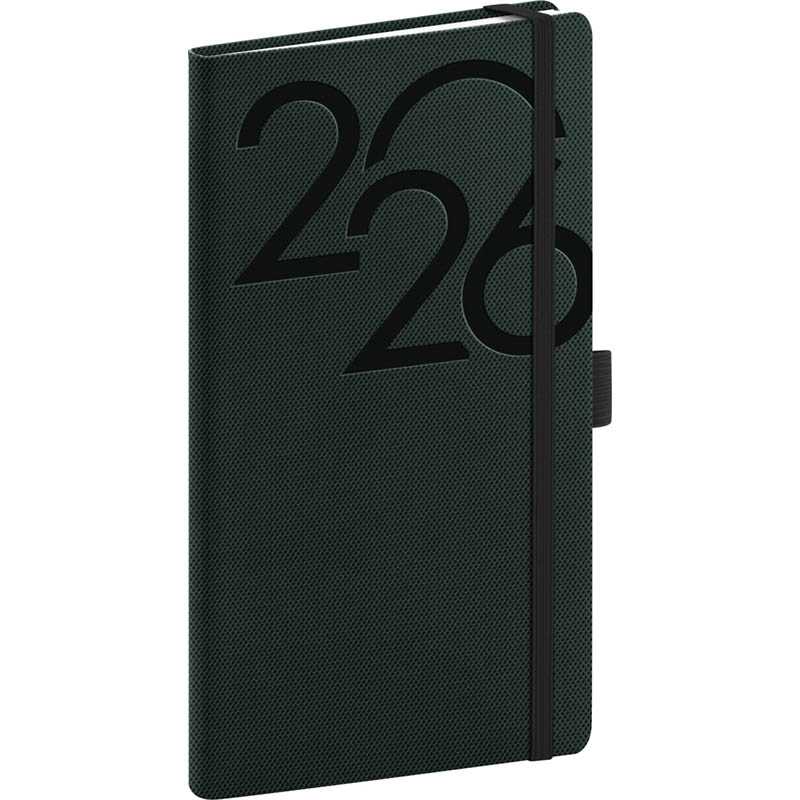 Vreckový diár Ajax 2026 v zelenej farbe. Jemne štruktúrovaný povrch s atypickým reliéfom je vhodný pre všetky typy razieb. Diár má zaguľatené rohy, pútko na ceruzku a elastickú gumičku. Týždenný rozvrh s česko-slovenským kalendáriom a doplnkovou angličtinou, nemčinou, maďarčinou a ruštinou.• kalendárium od decembra 2025 • ročný plánovací kalendár 2026–2027 • pracovný plánovací kalendár • sviatky Českej a Slovenskej republiky a medzinárodné sviatky • rozšírený zoznam českých mien • miesto pre osobné údaje • perforované rožkypriestor na poznámkyRozsah: 128 strán. Rozmer: 9 x 15,5 x 1 cm. Hmotnosť: 0,08. Papier: 70 g/m2. Väzba: tuhá knižná s gumičkou a pútkom na ceruzku. Kalendárium: 6 jazyčné (CZ, SK, GB, DE, HU, RU) .