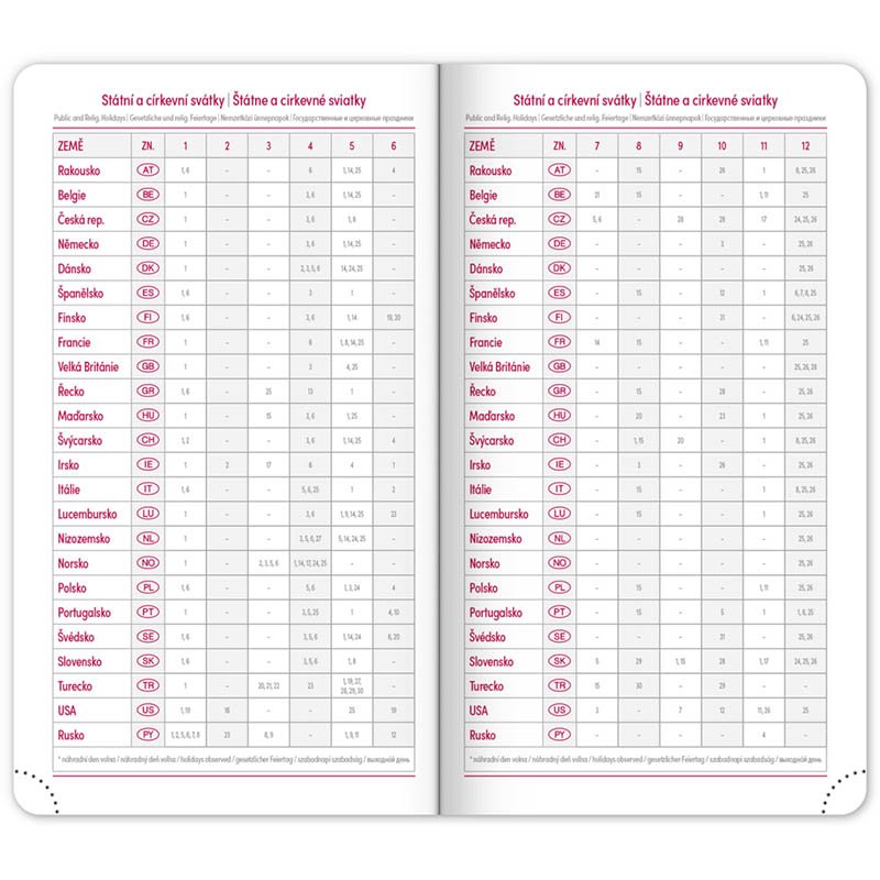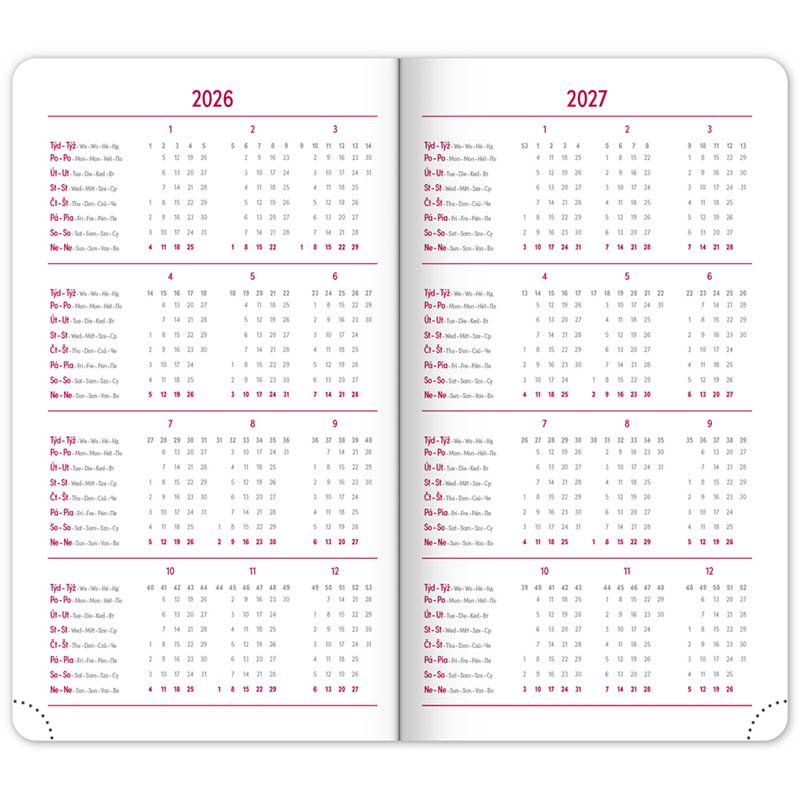 Nový rad diárov s výrazným letopočtom. Povrch má jemnú štruktúru a je vhodný pre všetky typy razieb. Týždenné rozloženie s česko-slovenským kalendáriom a doplnkovou angličtinou, nemčinou, maďarčinou a ruštinou.• kalendárium od decembra 2025 • ročný plánovací kalendár 2026–2027 • pracovný plánovací kalendár • sviatky Českej a Slovenskej republiky a medzinárodné sviatky • rozšírený zoznam českých mien • miesto pre osobné údaje • perforované rožky• priestor pre poznámkyRozsah: 128 strán. Rozmer: 9 x 15,5 x 1 cm. Hmotnosť: 0,08. Papier: 70 g/m2 krémový papier. Väzba: tuhá knižná. Kalendárium: 6 jazyčné (CZ, SK, GB, DE, HU, RU) .