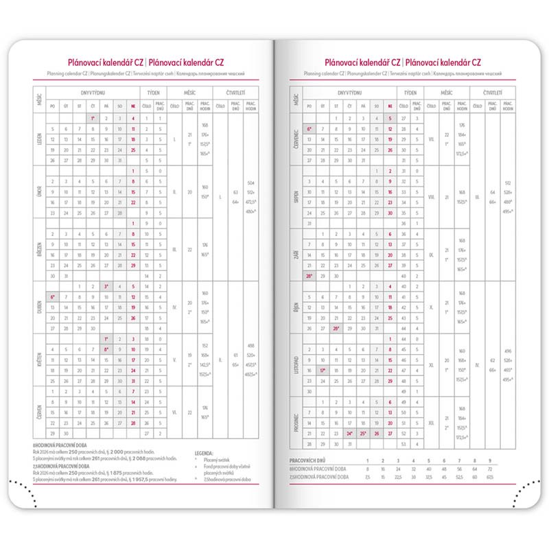 Nový rad diárov s výrazným letopočtom. Povrch má jemnú štruktúru a je vhodný pre všetky typy razieb. Týždenné rozloženie s česko-slovenským kalendáriom a doplnkovou angličtinou, nemčinou, maďarčinou a ruštinou.• kalendárium od decembra 2025 • ročný plánovací kalendár 2026–2027 • pracovný plánovací kalendár • sviatky Českej a Slovenskej republiky a medzinárodné sviatky • rozšírený zoznam českých mien • miesto pre osobné údaje • perforované rožky• priestor pre poznámkyRozsah: 128 strán. Rozmer: 9 x 15,5 x 1 cm. Hmotnosť: 0,08. Papier: 70 g/m2 krémový papier. Väzba: tuhá knižná. Kalendárium: 6 jazyčné (CZ, SK, GB, DE, HU, RU) .