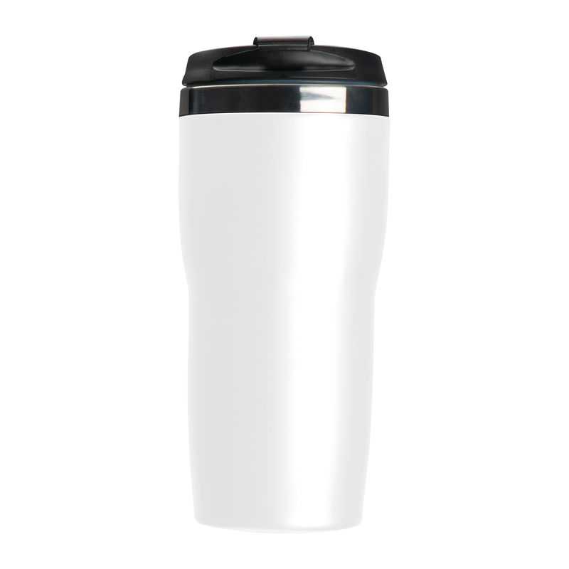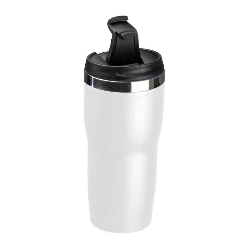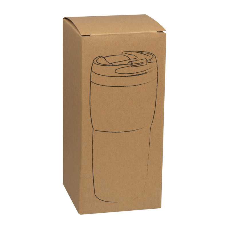 Nerezový cestovný pohár (90% recyklovaná nerezová oceľ) s dvojitou stenou a matným povrchom. PP viečko je nepriepustné a obsahuje PU a PET držadlo na ľahké prenášanie. Kapacita až 460 mL. Dodávané v darčekovej krabičke z kraftového papiera.
