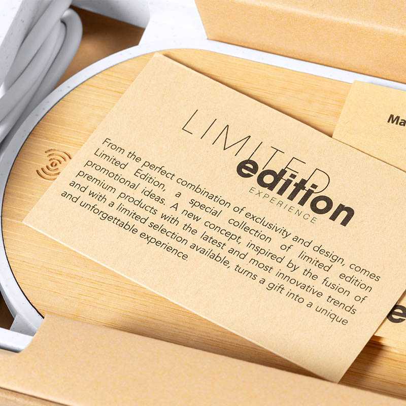 NOVINKA 2025. Distinguished Limited Edition line Wireless Charger with support function for mobile devices. Made of bamboo and resistant ABS and wheat cane casing. With 10W fast charge function and compatible with devices equipped with wireless charging technology. Includes 100cm charging cable and manual instruction in Spanish and English. From the perfect combination of exclusivity and design, come Limited Edition, a special collection of limited edition promotional ideas. A new concept, inspired by the fusion of premium products with the latest and most innovative trends and with a limited selection available, turn a gift into a unique and unforgettable experience. Exclusive Limited Edition presentation case, with a design protected by industrial property rights. Including card with description of Limited Edition in recycled cardboard.