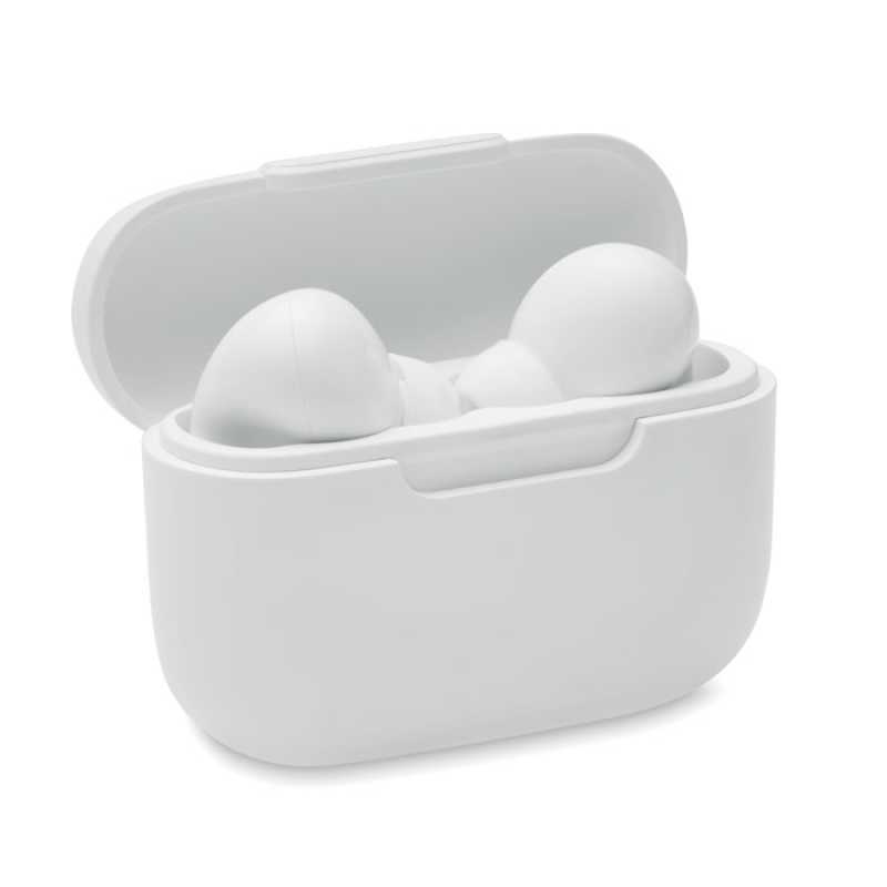 NOVINKA 2025. Nature line earphones, with Bluetooth® 5.0 connection and lithium battery. In elegant white finish and presented in a bamboo charging case. Ergonomically designed, including an integrated touch control button, with a matching charging base and LED charge indicator. Hands-free function and rechargeable, with micro USB cable included. Presented in attractive eco design box.