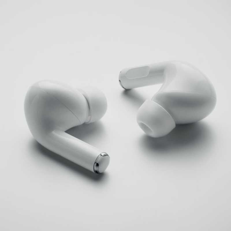NOVINKA 2025. In-ear headphones in elegant white finish and Bluetooth® 5.3 connection. Case with original spinner design, with a 200 mAh battery. Touch control button earbuds with hands-free function. Rechargeable, with Type C cable -included-. User manual available in Spanish and English.
