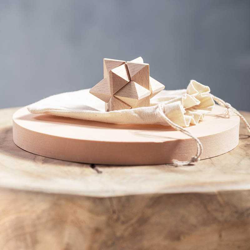Potešte svojich zákazníkov týmto krásnym 3D dreveným puzzle v tvare hviezdy. Uzatvárateľné bavlnené vrecko zabezpečí, že sa nič nestratí.