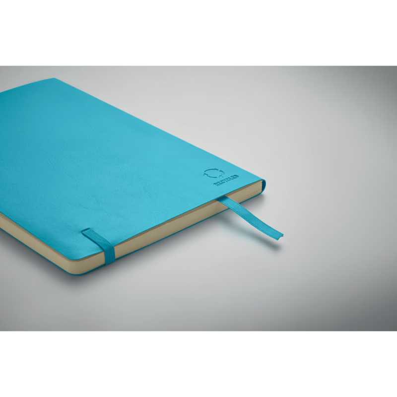 NOVINKA 2025. Zápisník A5 s měkkými deskami z recyklovaného PU (81% recyklovaný polyester a 19% PU). 160 linkovaných stran (80 listů)z recyklovaného papíru. Elastická uzavírací páska a záložka. Vnitřní zadní kapsa.