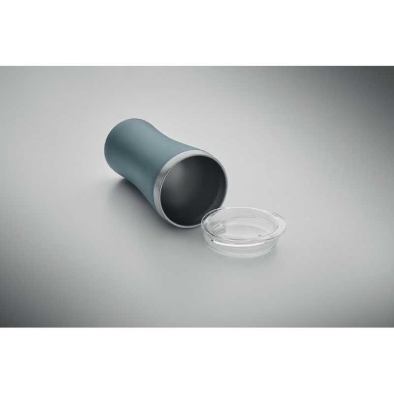 Malý dvoustěnný vakuově izolovaný pohárek z recyklované nerezové oceli (90 % recyklované nerezové oceli a 10 % nerezové oceli) s víčkem s otvorem na pití z průhledného PP. Objem: 160 ml.