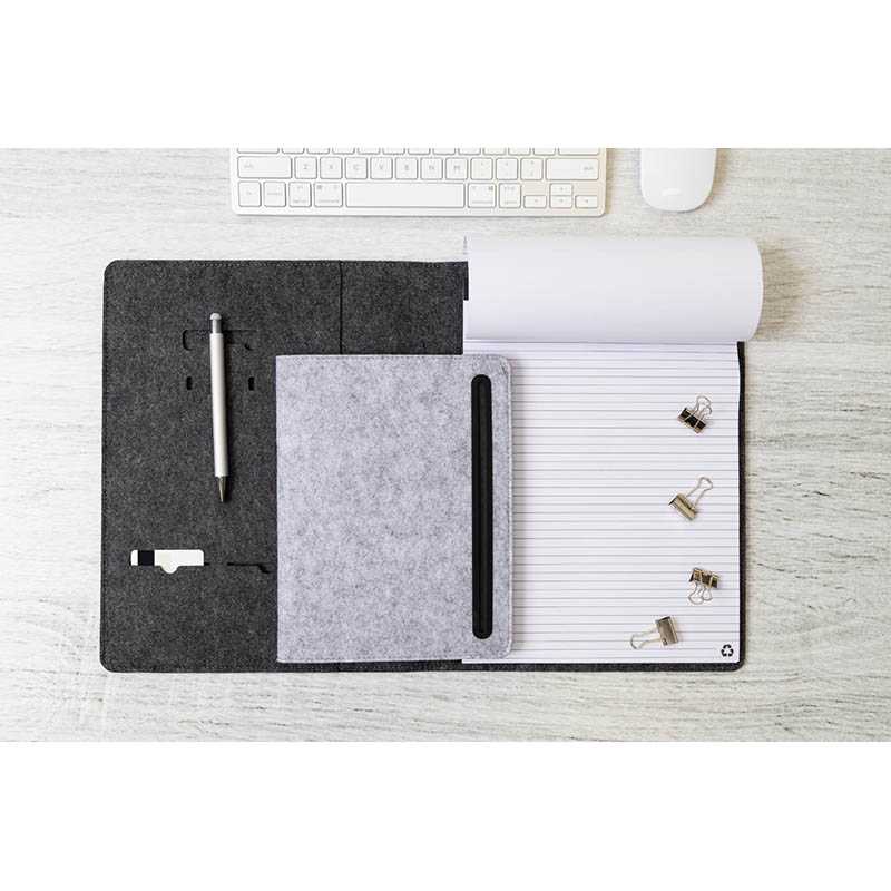 NOVINKA 2025. Plstená sloha A4 na dokumenty z RPET s prednými a niekoľkými vnútornými vreckami s organizérom. S 20 linajkovými listami poznámkového bloku z recyklovaného papiera.