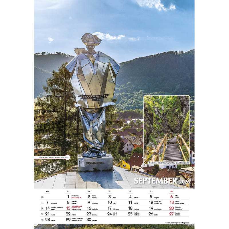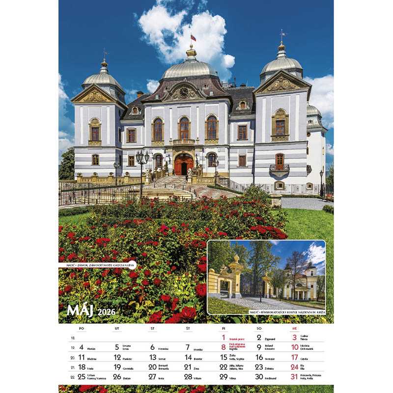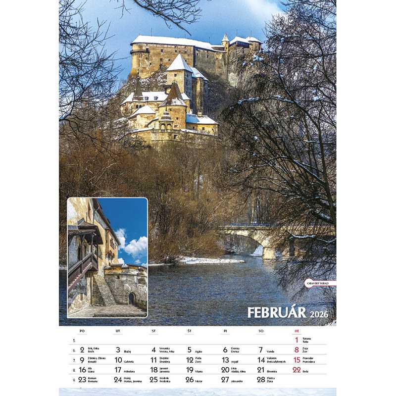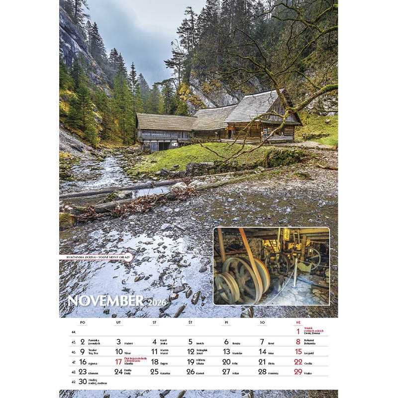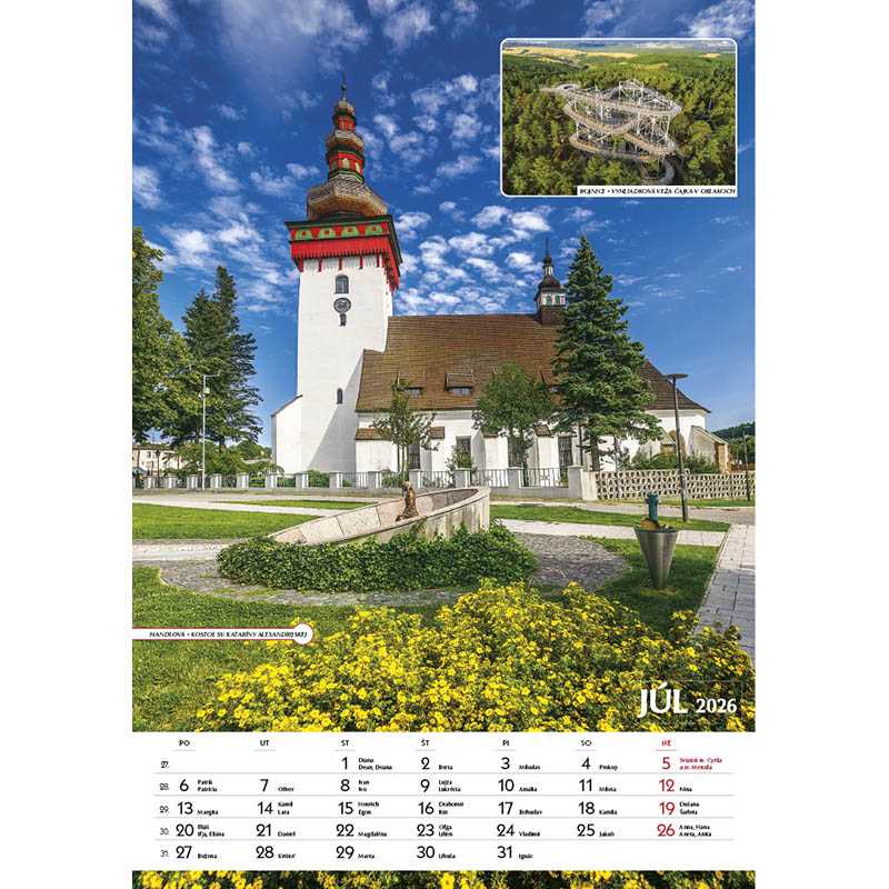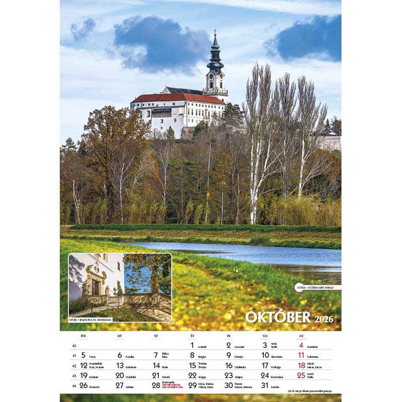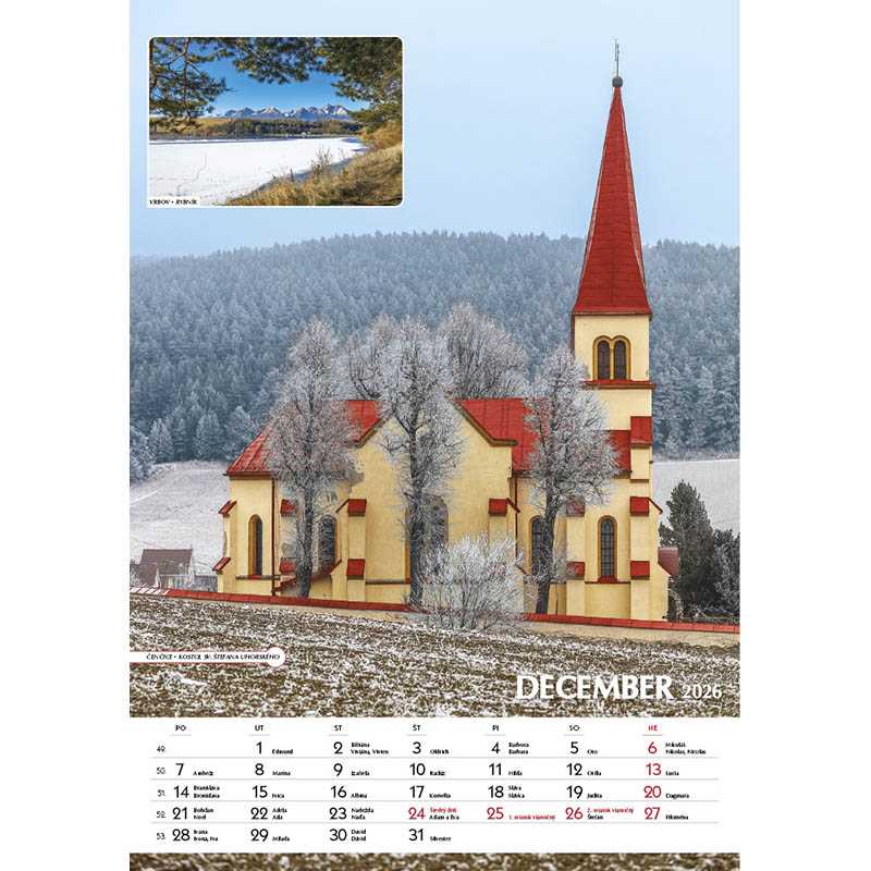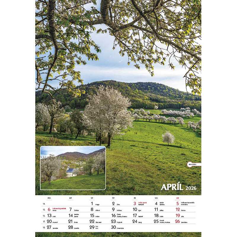 Kalendár Slovenská krajina 2026. Formát kalendára: 31,5 x 45 cm . Kalendárium: slovenské trojmesačné menné . Rozsah kalendára: 14 listov . Twinová väzba . Priestor na potlač: 31,5 x 7 cm