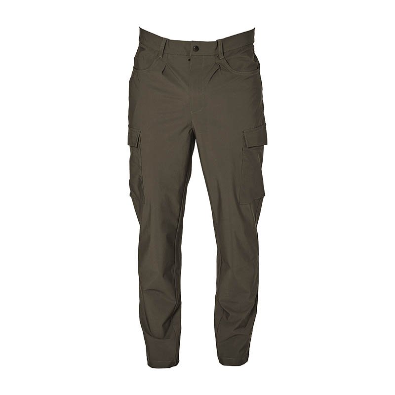 Front zip with button Elastic waistband Back safety seam Darts Six pockets: 2 French pockets 2 patch pockets with bellows, cover flaps and Velcro 2 back pockets with bellows, cover flap
