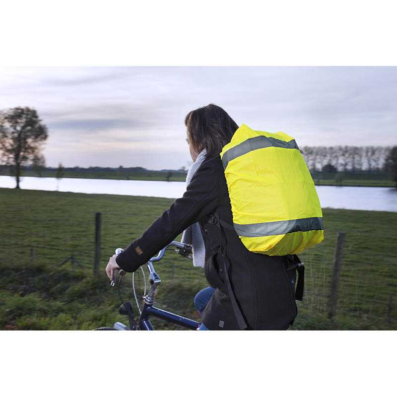 100% Polyester, neon safety cover for backpacks with two reflective stripes. Elastic to fit different sizes. For promotional use only.