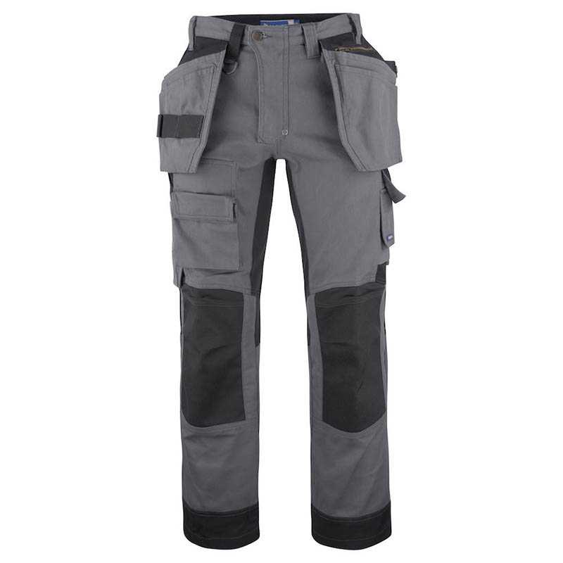 Roomy hanging pockets with extra compartments and internal cordura reinforcement. Front pocket where hanging pockets can be stowed. Back pockets with reinforced inside, flap on left one. Reinforced front folding rule pocket, detachable at bottom, pen pockets and knife button. Leg pocket with mobile compartment. Padded yoke for optimum comfort. Stretch fabric in crotch. Prebent knee with kevlar kneepad pockets. The kneepad pockets have two height levels. Cordura details with reflex. Material: 60% Cotton, 40% Polyester. 320gsm 100% polyamide reinforcement Colour: Black-99 Size: C44–C62, D84–D120, C146–C156