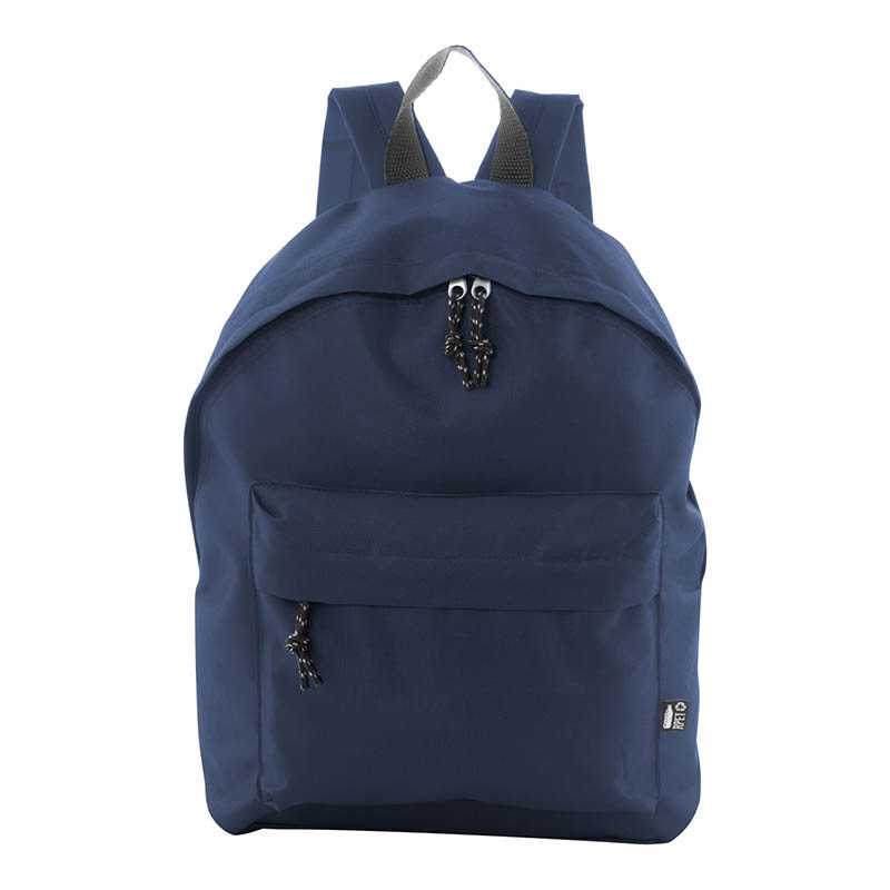 Batoh RPET s priehradkou na zips a predným vreckom, bočné sieťované vrecká, polstrovaný chrbát a ramenné popruhy. 300D RPET polyester s výrazným štítkom RPET.