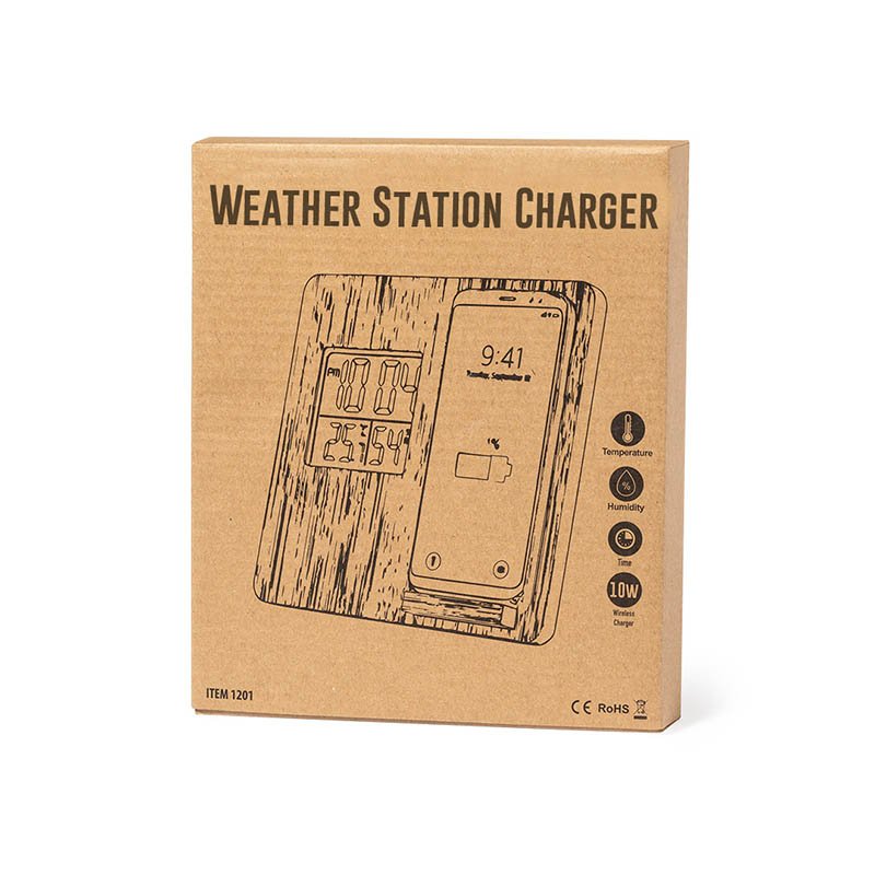 NOVINKA 2025. Nature line weather station with integrated 10W wireless charger. Made of polished bamboo, with thermometer and hygrometer functions. Including 1m Micro USB charging cable and compatible with devices equipped with wireless charging technology. Battery powered clock (cell button included) and presented in an attractive eco-design box. Instruction manual available in English and Spanish.