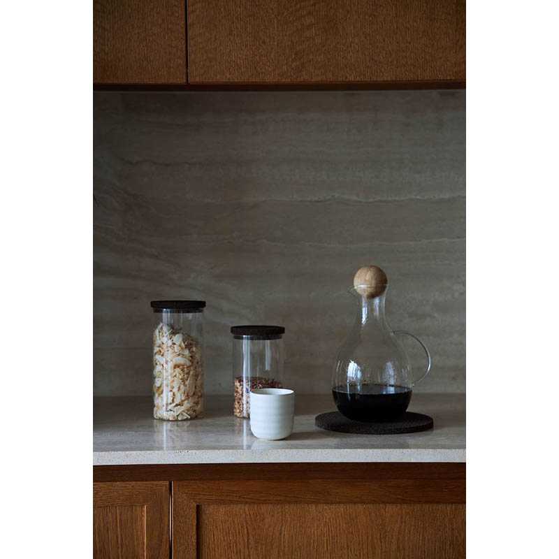 Product Name: Nature box with cork lid L Product Number: 5018337 Product Fabrics: Mouth-blown borosilicate glass/cork Description: Glass jars for storage with a dark brown cork lid. A lovable and classic combination which never goes out of fashion. These jars can store pantry goods like granola, flour or pasta in a neat and beautiful way. They are also suitable for children’s toys or in the bathroom for cotton pads. The jars are easily stackable. Available in two sizes.