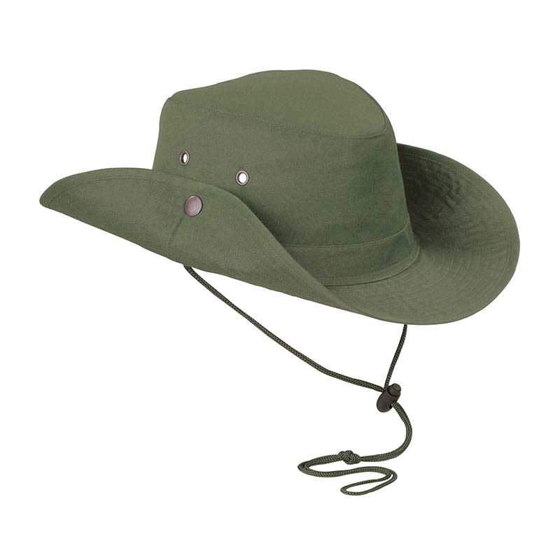 Polyester safari wide-brimmed hat with ventilation eyelets, adjustable brim and adjustable nylon chin cord