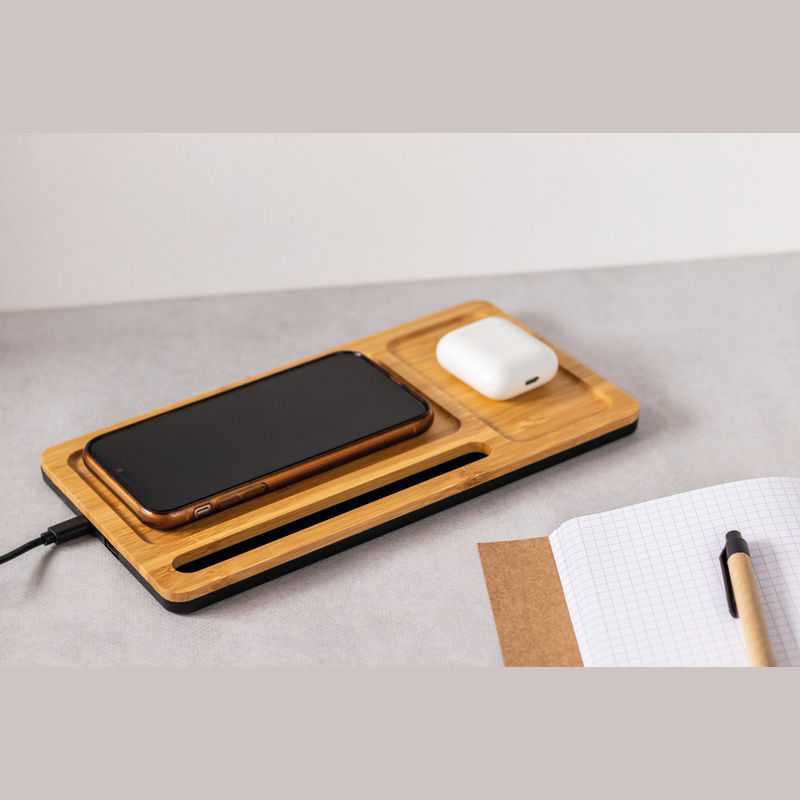Ideálny doplnok na váš pracovný stôl. Stolný organizér z ekologického bambusu umožňuje udržať stôl stále čistý a prehľadný. Vďaka zabudovanému nabíjaniu môžete nabíjať jednoduchým položením telefónu bez použitia káblov. Vstup 5V / 1.5A, bezdrôtový výstup: 5V / 800mA 5W. Vrátane 1,5m dlhého micro USB kábla.